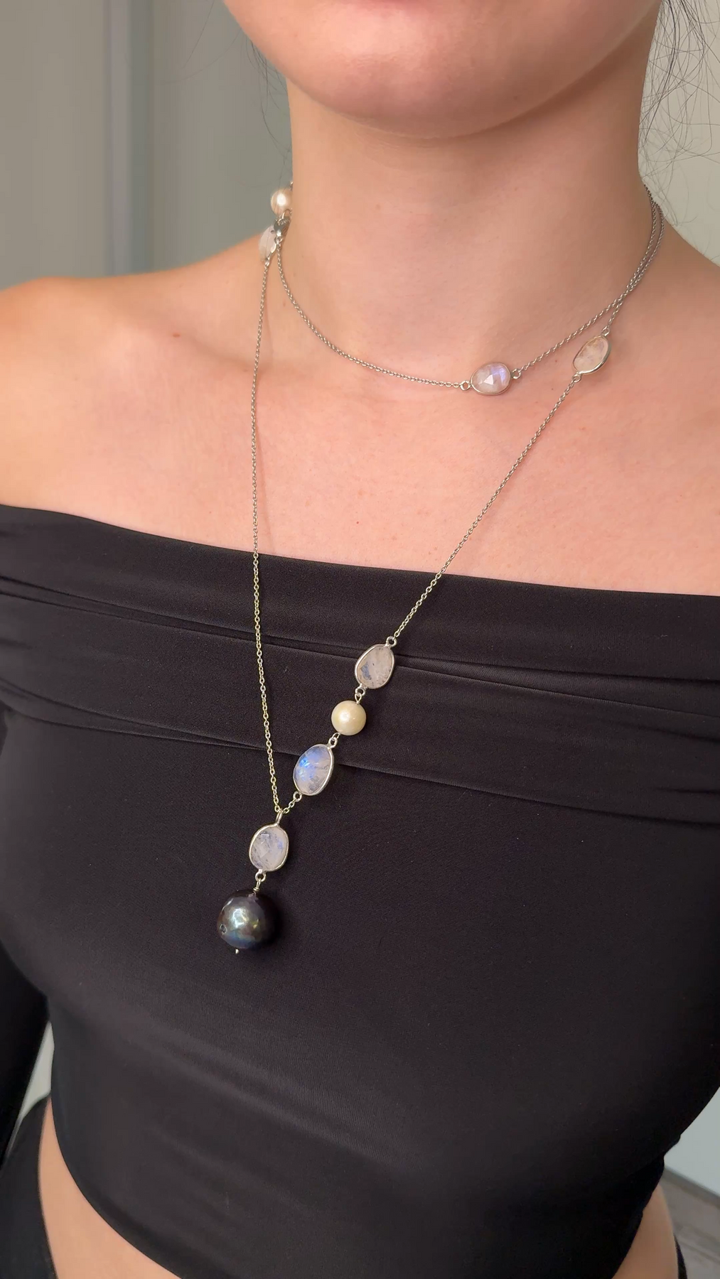 This necklace is a stunning piece crafted from sterling silver, featuring a beautiful combination of a luminous black pearl and a delicate white pearl. It's also adorned with moonstone accents, giving it a really elegant, ethereal charm. The total length is about 38 centimeters. This versatile necklace can be worn in two ways: wear it long for a graceful look or wrap it around the neck for a layered style. Gemstones Fresh water Black Pearl Moonstone White Pearl, Round shape