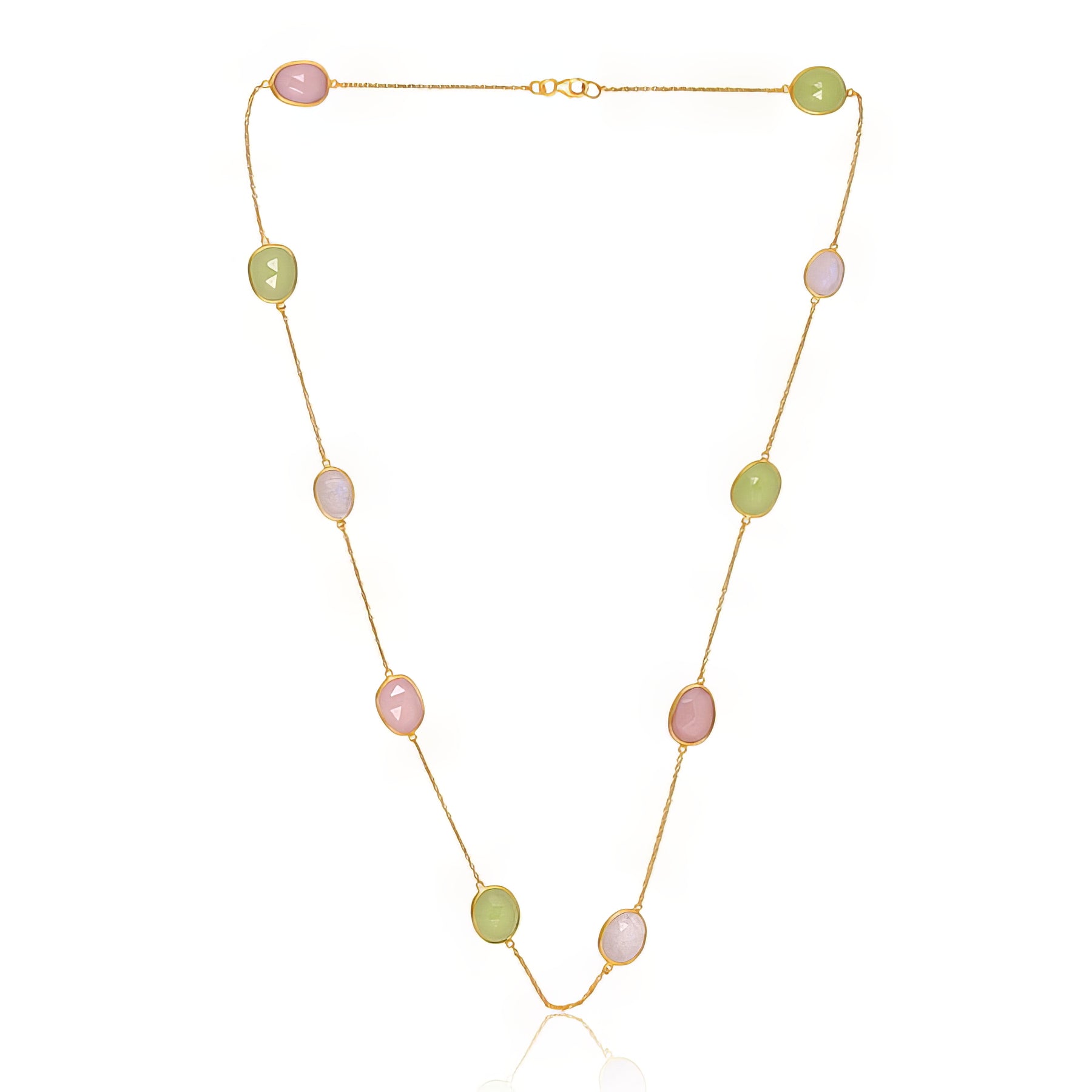 Our Candy Lane Necklace is crafted with 18K gold plated on solid Sterling Silver. It features Rainbow Moonstone, Rose Chalcedony, Prehnite Chalcedony gemstones.