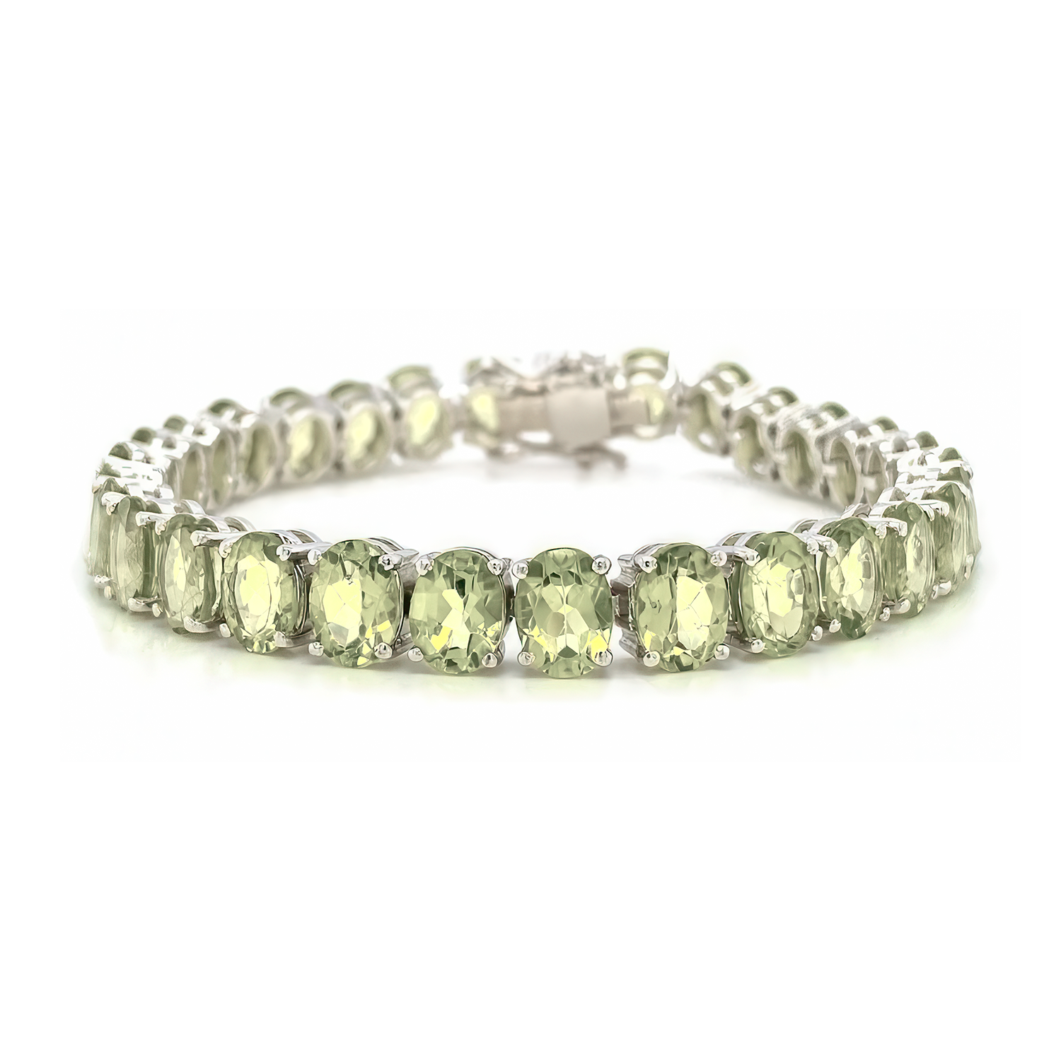 Green Amethyst Zest Bracelet features 27 stunning oval green amethyst stones, each measuring 10 x 8 mm. Set in rhodium-plated on solid sterling silver, this 19.5cm lenght bracelet offers a luxurious feel and a captivating green hue. With a total weight of 24.82 grams