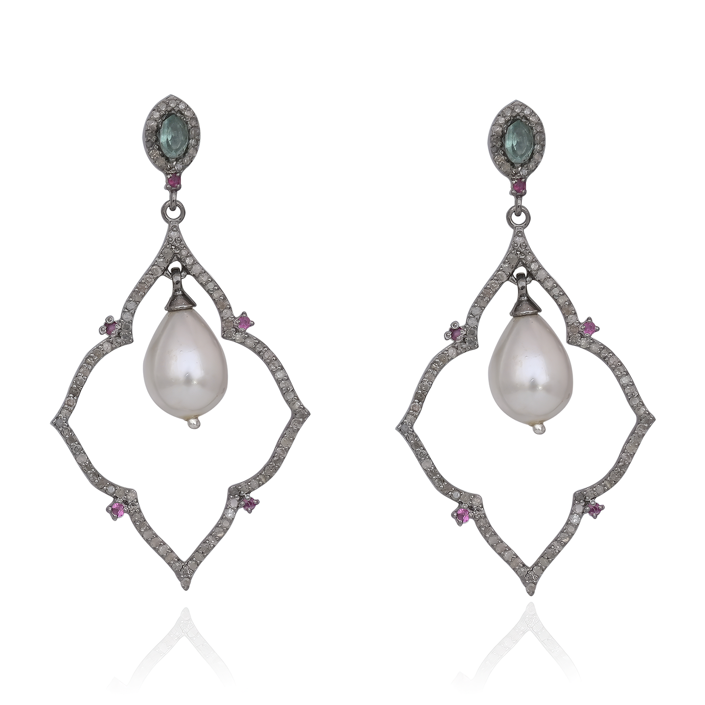 Inspired by the elegance of the Art Deco era, the Josephine Earrings exude timeless charm. Crafted with meticulous attention to detail, they feature 3x4mm Emerald, and Ruby, Pearl, and paved Moissanite. These stunning pair of earrings are set in solid sterling silver with an Rhodium plating, making them perfect for adding a touch of vintage sophistication to any outfit.