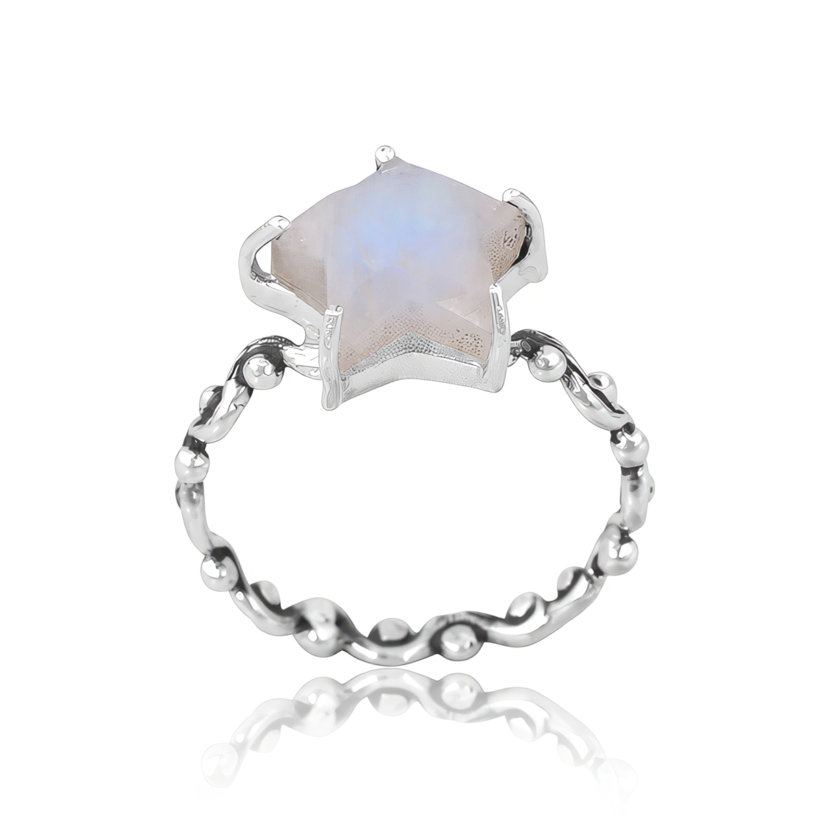 Illuminate your style with the Europa Ring, a captivating piece crafted from oxidized solid sterling silver. This exquisite ring features a mesmerizing star-shaped rainbow moonstone, known for its enchanting play of colors. The intricate, polished band adds a touch of elegance and sophistication, making it a perfect statement piece for any occasion. Embrace the celestial beauty of the Europa Ring and let its stellar charm adorn your fingers.