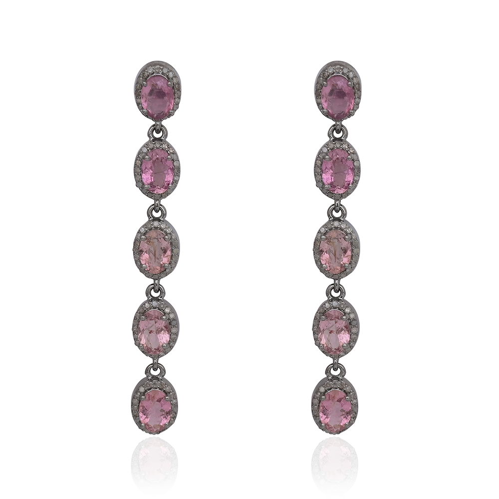 Inspired by the elegance of the Art Deco era, the Stephany Earrings radiate timeless charm. Made with 4.500ct of Pink Turmalines and 1.1 mm and 1.8ct of Diamonds, exquisite long earrings are crafted in solid sterling silver with Rhodium or Black Rhodium plating. Perfect for adding a touch of vintage sophistication to any outfit..